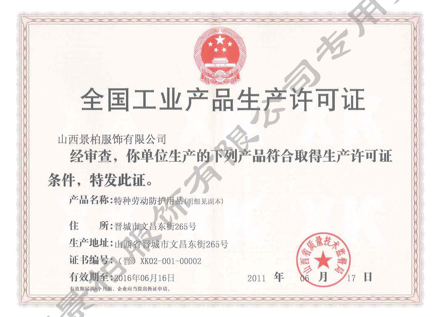 2011年,山西景柏服饰有限公司获得全国工业产品生产许可证,成为山西省第二家获得该资质的企业;此外,景柏服饰有限公司还获得了防静电A级、阻燃B级的资质,取得了新型矿工上衣、矿 工裤子、矿工腰带、矿工靴四项国家专利。