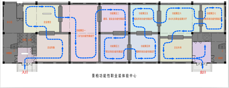 这里是景柏职业装体验中心的平面设计图。从这里我们可以直观的看到整个体验中心的全景。整个体验中心共包括十个大厅:企业形象厅、企业理念厅、工矿业功能性服装厅、建筑能源厅、军队系统厅、消防厅、医疗卫生职业装服装厅、办公礼仪职业装展示厅、文教系统功能性服装厅以及企业未来厅。